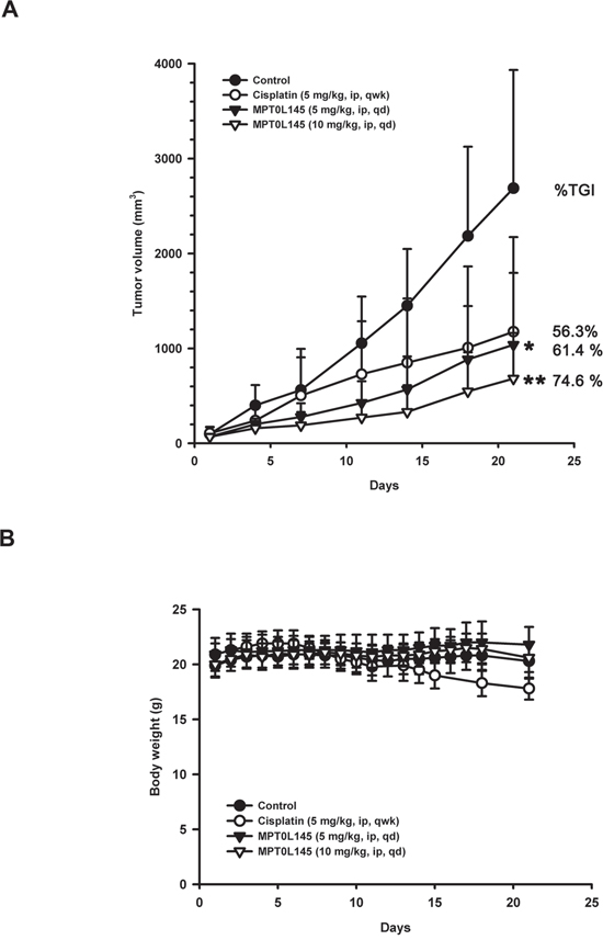 To evaluate the anticancer activity of MPT0L145 in the preclinical setting, we examined its effects in athymic nude mice bearing established RT-112 tumor xenografts. MPT0L145 significantly suppressed tumor growth in a dose-dependent manner (Figure 6A). The percentages of tumor growth inhibition (% TGI) of cisplatin (5 mg/kg) and MPT0L145 (5 and 10 mg/kg) are 56.3%, 61.4% and 74.6%, respectively. MPT0L145 exhibited not only comparable antitumor activity to cisplatin, but also better safety, as established from assessment of body weight loss after treatment (Figure 6B). Accordingly, we conclude that MPT0L145 possesses significant antitumor activity in vivo.