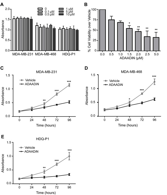Figure 2: Effects of BRG1 inhibitors on breast cancer cell proliferation and viability. A. Cell proliferation was measured by MTT assay in three triple negative breast cancer cell lines (MDA-MB-231, MDA-MB-468 and HDQ-P1) with increasing doses of PFI-3 treatment for 72 hours. B. Cell viability in MDA-MB-231 cells treated with increasing doses of ADAADi was examined by MTT assay for 48 hours. MTT assays were performed on MDA-MB-231 C., MDA-MB-468 D. and HDQ-P1 E. cells treated with 2 μM ADAADi. Each data point represents the mean of 3 independent experiments performed in triplicate. Error bars are standard deviations. *P < 0.05, **P < 0.01, ***P < 0.001.