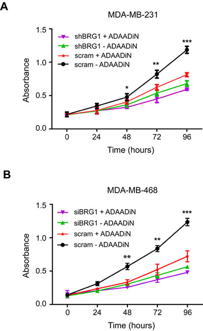 Figure 3: ADAADiN-mediated inhibition of triple negative breast cancer cell proliferation and viability is due to inhibition of BRG1. A. Cell proliferation was measured by MTT assay after ADAADi treatment, inducible BRG1 knockdown, or both in MDA-MB-231 cells. B. Cell proliferation was measured by MTT assay after ADAADi treatment, BRG1 knockdown by siRNA, or both in MDA-MB-468 cells. Each data point is the mean from 3 independent experiments performed in triplicate; error bars are standard deviations. *P < 0.05, **P < 0.01, ***P < 0.001.