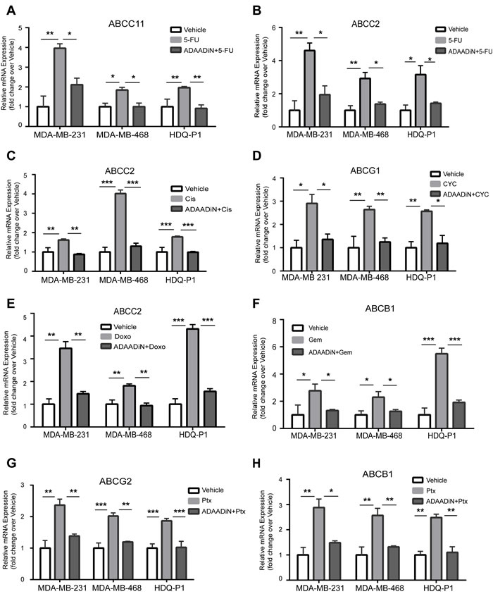 Figure 4: ADAADiN blocked drug-induced ABC transporter gene expression in triple negative breast cancer cell lines. Bar graphs present relative mRNA expression of specific ABC transporter genes in response to vehicle, the indicated chemotherapeutic drug, and the indicated chemotherapeutic drug in the presence of ADAADiN in each of the indicated breast cancer cell lines. Each bar presents the mean of 3 independent experiments performed in duplicate; error bars are standard deviations. *P < 0.05, **P < 0.01, ***P < 0.001. A.-B. 5-FU mediated induction of ABCC11 and ABCC2. C. Cisplatin (Cis) mediated induction of ABCC2. D. Cyclophosphamide (CYC) mediated induction of ABCG1. E. Doxorubicin (Doxo) mediated induction of ABCC2. F. Gemcitabine (Gem) mediated induction of ABCB1. G.-H. Paclitaxel (Ptx) mediated induction of ABCG2 and ABCB1.