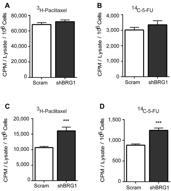 Figure 5: Targeting BRG1 results in increased retention of chemotherapeutic drugs. Radiolabeled paclitaxel or 5-FU were incubated with MDA-MB-231 cells expressing a control (Scram) shRNA or shRNA targeting BRG1. A.-B. Cellular uptake was determined by scintillation counting after harvested cells were washed repeatedly, counted, and lysed. Results were normalized by cell count. C.-D. Drug retention was determined by scintillation counting after cells were pulse-chased and prepared as described in Materials and Methods. Each bar presents the mean of 3 independent experiments performed in triplicate; error bars are standard deviations. ***P < 0.001.