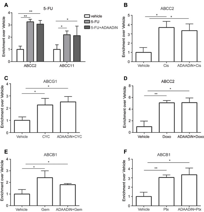 Figure 6: Chemotherapeutic drugs increased BRG1 binding at ABC transporter genes in a manner independent of ADAADiN. ChIP was performed in MDA-MB-231 cells treated with vehicle, chemotherapy drug alone or chemotherapy drug in combination with ADAADi. BRG1 binding at transporter genes was measured by quantitative PCR using primers listed in Supp. Table 2. The bar graphs represent the ratio (enrichment) of BRG1 binding to sequences near the indicated transporter gene in cells treated with the indicated chemotherapeutic drug alone or in combination with ADAADi relative to binding in vehicle treated cells. Each bar presents the mean of 3 independent experiments performed in duplicate; error bars are standard deviations. *P < 0.05, **P < 0.01, ***P < 0.001. A. BRG1 binding at the ABCC2 and ABCC11 genes was analyzed in vehicle, 5-FU and ADAADi plus 5-FU treated cells. B. BRG1 binding at ABCC2 was analyzed in vehicle, cisplatin (Cis) and ADAADi plus Cis treated cells. C. BRG1 binding at ABCG1 was analyzed in vehicle, cyclophosphamide (CYC) and ADAADi plus CYC treated cells. D. BRG1 binding at ABCC2 was analyzed in vehicle, Doxorubicin (Doxo) and ADAADi plus Doxo treated cells. E. BRG1 binding at ABCB1 was analyzed in vehicle, gemcitabine (Gem) and ADAADi plus Gem treated cells. F. BRG1 binding at ABCB1 was analyzed in vehicle, paclitaxel (Ptx) and ADAADi plus Ptx treated cells.