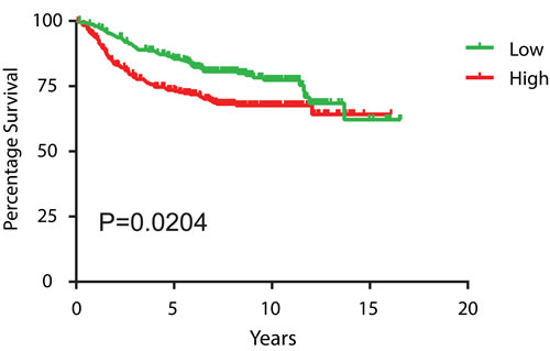 To determine the correlation between BRG1 expression and breast cancer patient survival, we retrieved 7 microarray datasets of human breast cancer (GSE1456, GSE2034, GSE2990, GSE3494, GSE12093, GSE11121 and Chin et al., combined N = 1339) profiled on Affymetrix HG-U133A platform [69-75] from Gene Expression Omnibus (GEO) (http://www.ncbi.nlm.nih.gov/geo) and European Bioinformatics Institute (http://www.ebi.ac.uk/arrayexpress for Chin et al, 2006 [75]). We normalized these datasets using MAS 5.0 software in GeneSpring 12.0 (Agilent Technologies, Santa Clara, CA), scaled to a mean target intensity of 600, and log2 transformed. 88 samples from GSE2990 were also used in GSE3494, and thus excluded from GSE2990. 23 samples without survival information and 7 samples with distance metastasis-free survival of 0 were excluded, which left 1221 non-redundant samples for survival analysis. There was a negative correlation between BRG1 expression level and patient prognosis, in which high levels of BRG1 were associated with poor prognosis (Figure 7). This result provides independent corroboration of a prior study [27] linking BRG1 levels with poor clinical outcomes of breast cancer patients. That conclusion, like our analysis of patient data here, was not limited to triple negative tumors, which make up only about 15% of patient tumors. Future studies will need to determine whether specific breast tumor subtypes have a negative BRG1 level correlation with prognosis.