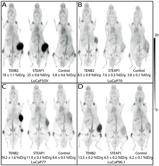 Figure 3: Maximum intensity projections from mouse coronal views of 89Zr-immunoPET images obtained 5 days post injection of TENB2, STEAP1 and control (gD) mAbs in four LuCaP tumor types: A. LuCaP35V, B. LuCaP70, C. LuCaP77, and D. LuCaP96.1. Tumors are growing on the flank visible as areas of intense dark uptake in some images. The intensity scale bar is calibrated as percentage of the injected dose per gram (%ID/g).