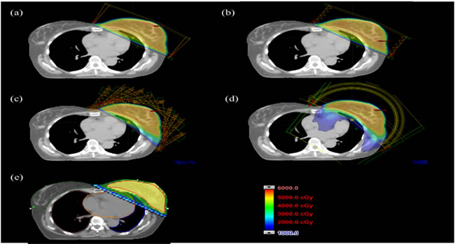 Figure 1: Graphical view of the isodose lines in the axial view for the patient 1 corresponding to Table 1 for the a. three-dimensional conformal radiation therapy (3D-CRT) plan, b. field-in-field forward-planned intensity-modulated radiation (FinF) plan, c. intensity-modulated radiation therapy (IMRT) plan, d. volumetric modulated arc therapy (VMAT) plan, and e. TOMO plan.