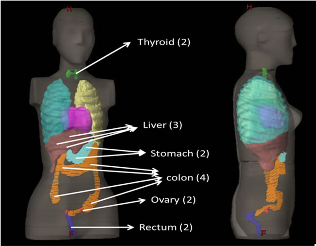 Figure 2: Detector positions in out-of-field organs (with numbers of RPLGDs in parentheses) in the female RANDO phantom.