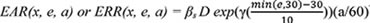 where ERR and EAR are an excess relative risk and an excess absolute risk, respectively, attained at the age of a as a result of the radiation exposure at the age of