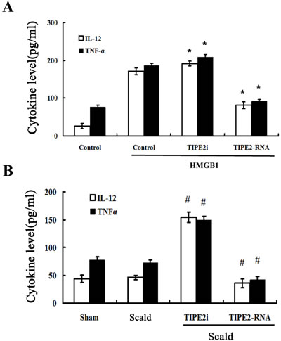 Figure 5: TIPE2 inhibited cytokine expression and secretion in DCs (n = 10, in each group). Immature DCs were cultured with the presence of 100 ng/ml HMGB1 or without HMGB1 (control) for 24 h. IL-12 and TNF-α levels were measured by ELISA in vitro A. or in vivo B., respectively. Levels of IL-12 in the supernatants of DC were not markedly decreased after thermal injury, but TNF-α level was significantly lower in animals subjected to scald injury compared with sham injury after thermal injury. Treatment with siRNA to inhibit TIPE2 expression could significantly enhance the levels of IL-12 and TNF-α. TIPE2 over-expression could significantly decrease the levels of IL-12 and TNF-α. Results of experiments were shown as the mean ± SD. Statistical significance: in vitro, *P < 0.01 as siRNA-TIPE2 or TIPE2-RNA group versus control(HMGB1) group; in vivo, #P < 0.01 as siRNA-TIPE2 or TIPE2-RNA group versus scald group.