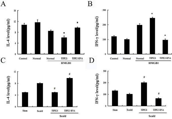 Figure 7: Effect of TIPE2 on the T-cell differentiation induced by DCs (n = 10, in each group). A. CD4+ T cells were incubated with ConA (5 μg/mL) for 18 h, then co-cultured with stimulated DCs (normal) at a ratio of 1:200 or cultured without DCs (control). IL-4 levels in culture medium were measured by ELISA. B. After thermal injury, DCs were cocultured with CD4+ T cells at a ratio of 1:200. IL-4 levels in culture medium were determined by ELISA to evaluate Th1/Th2 polarization. After thermal injury IL-4 levels produced by T cells response to Con A were markedly increased, whereas IFN-γ levels were markedly lowered. SiRNA-TIPE2 treatment could significantly revert elevated levels of IL-4 and lowered levels of IFN-γ after thermal injury. C. In vitro, IFN-γ levels in culture medium were determined by ELISA. D. In vivo, IL-4 levels in culture medium were determined by ELISA to evaluate Th1/Th2 polarization. Results of experiments were shown as the mean ± SD. Statistical significance: in vitro, *P < 0.01 as siRNA-TIPE2 or TIPE2-RNA group versus normal (HMGB1) group; in vivo, #P < 0.01 as siRNA-TIPE2 or TIPE2-RNA group versus scald group.