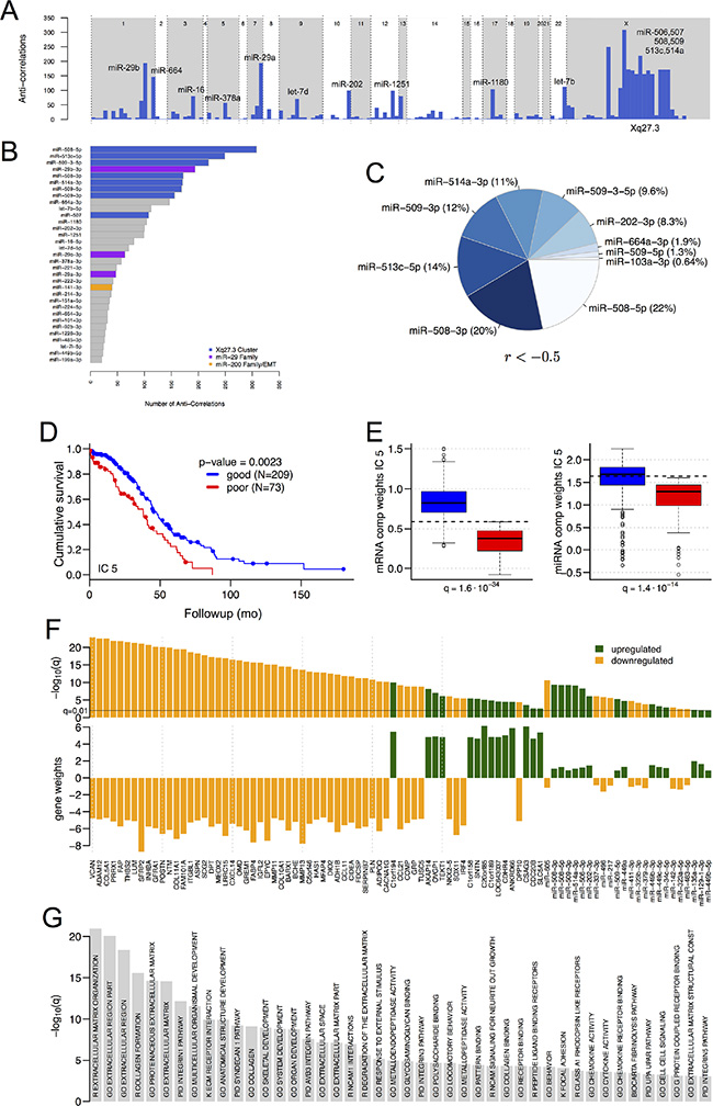 Figure 1: Significant miRNAs, mRNAs and pathways. (A) Schematic transcriptome-wide view of the number of significant (FDR < 0.05) anti-correlations per miRNA (Spearman r < –0.3, for miRNAs with at least one significant anti-correlation). miRNA locations are not to scale. (B) The miRNAs in (A), ordered by the number of miR-gene interactions, and thresholded at 20 interactions. (C) miR-gene interactions with Spearman correlation coefficients less than –0.5. (D–G) Independent component analysis. (D) Kaplan-Meier plot for overall survival when samples are segregated by high vs. low component weights in IC 5 (see text). (E) Component weights of IC 5, for samples with favorable vs. unfavorable survival, for the mixing matrices for mRNAs (left) and miRNAs (right). Because samples with favorable survival have larger component weights than samples with favorable vs. unfavorable survival in IC 5, mRNAs with negative gene weights in this IC will be downregulated in samples with favorable survival. (F) Gene weights and q-values for the mRNAs and miRNAs that have significant gene weights in IC 5 (thresholds α = 6 for mRNAs, 1 for miRNAs) and are differentially expressed between samples with favorable and unfavorable overall survival. Green vs. orange: upregulated vs. downregulated in samples with favorable survival. (G) Enriched GO terms and pathways for IC 5 genes (q < 0.001, hypergeometric test, FDR-correction). R and K indicate REACTOME and KEGG, respectively.