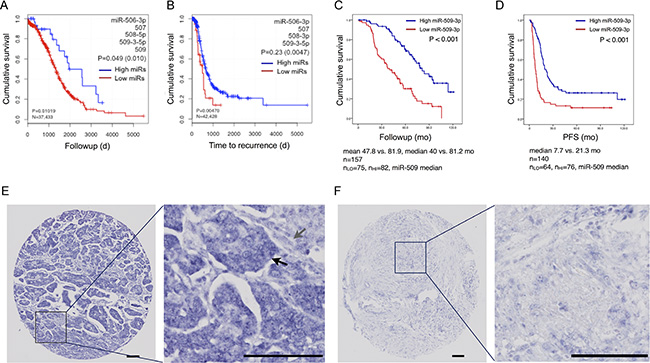 For miR-509-3p, low and high refer to ISH staining intensities that are below and above the median intensity.