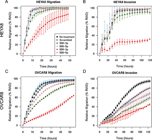 Figure 3: In vitro 96-well migration and invasion results after transfecting miR mimics into HEYA8 and OVCAR8 cells. (A) Migration and (B) invasion for HEYA8 cells (N = 3). (C) Migration and (D) invasion for OVCAR8 cells (N = 3). Error bars show standard deviations. The time courses start 72 h after transfection.