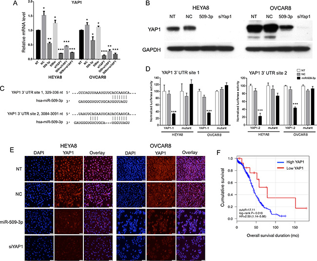 Figure 4: YAP1 target validation, and correlation with survival and migration. (A) Relative mRNA transcript levels by qPCR and (B) protein levels by Western blot after miR-509-3p transfection and siRNA for YAP1, for HEYA8 (H8) and OVCAR8 (O8) cell lines. Error bars represent standard deviations. *, **, and *** indicate P < 0.1, 0.01 and 0.001. (C) Predicted binding sites in the YAP1 3′ UTR. (D) YAP1 luciferase reporter activity for the two predicted binding sites, 48 h after transfecting a miR-509-3p mimic into HEYA8 and OVCAR8 cells. NT = no treatment. miR-NC = scrambled miR-509-3p mimic. Error bars represent standard deviations. *** indicates P < 0.001. (E) Yap1 immunofluorescence staining (middle panel) of non-transfected (NT) HEYA8 and OVCAR8 cells or cells transfected with miR-509-3p, Yap1 siRNA (siYap1) or a negative control scrambled miRNA (NC) for 72 hr. Cell nuclei were stained with DAPI (left panel). Scale bars represent 50 um. (F) Kaplan-Meier curves for overall patient survival for high vs. low YAP1 abundance, using TCGA sequencing data and a 17 RPKM threshold [20].