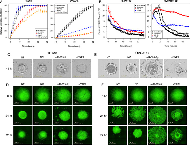 Figure 5: The effect of miR-509-3p and siYAP1 on cell migration and 3D aggregate formation for HEYA8 (left) and OVCAR8 (right) cells. (A) In vitro 96-well migration time-course results for miR-509-3p transfection and for siRNA for YAP1, in HEYA8 and OVCAR8 cells. (B) Time course evolution of spheroidal aggregation. (C, D) Phase contrast and (E, F) fluorescence micrographs of time-course experiments. For treated cases in (A–F), time courses start (0 hr) 72 h after transfection. NT: no treatment. NC: treatment with a scrambled miR-509-3p mimic.