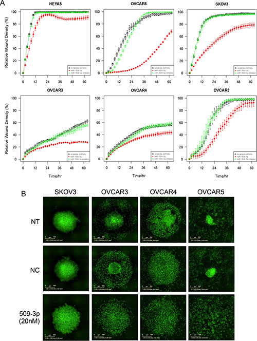 Figure 6: The effect of miR-509-3p and siYAP1 on migration and 3D aggregate formation for SKOV3, OVCAR3, 4 and 5 cell lines. (A) In vitro 96-well migration time-course results for miR-509-3p transfection and siRNA for YAP1. The time courses start 72 h after transfection. (B) Fluorescence micrographs of time course evolution of spheroidal aggregation. NT: no treatment. NC: treatment with a scrambled miR-509-3p mimic.