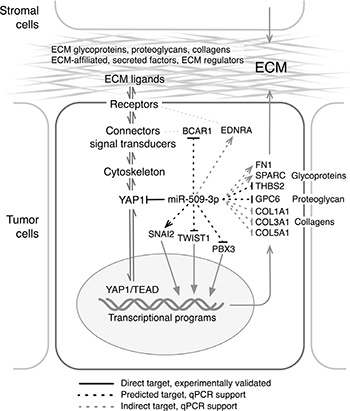 Curiously, while YAP1 is associated with the Hippo pathway, the mRNAs that were strongly inversely correlated to miR-509-3p in TCGA ovarian tumors were enriched not for Hippo pathway genes but for structural and regulatory components of the ECM. YAP1 is functionally associated with the ECM through its non-canonical, Hippo-independent role as a mechanotransducer, and, as a central effector in mechanotransduction, YAP1 influences how tumor cells sense and respond to the mechanical properties of the ECM and to their microenvironment [32, 33]. ECM changes have been reported to influence cell proliferation, differentiation, migration and invasion during normal development and differentiation [62], and mutations in mechanotransduction mediators, which are sensed by the cell as perturbations in ECM stiffness, have been associated with a number of diseases, including cancer [32, 33]. ECM rigidity and YAP1 activation can interact to maintain cancer-associated fibroblasts [63].