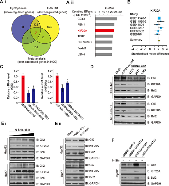 Figure 1: Expression of KIF20A is regulated by the Hh signaling pathway. (Ai) Venn diagram of Hh inhibitors down-regulated genes in HCC-LM3 cells and overexpressed genes identified by meta-analysis in the HCC cohort. (Aii) Seven candidate genes from (Ai) were sorted by z-scores that were extracted from the meta-analysis (Combine Effects). (B) Forest plot of KIF20A expression across all meta-analysis datasets. (C) HCC-LM3 cells transfected with the indicated plasmids were subjected to real-time PCR analysis for Gli2 and KIF20A expression. *P < 0.05, **P < 0.01. (D) HCC-LM3 and MHCC-97H cells were transfected with shRNA-control or shRNA-Gli2 for 48 h and were harvested for WB analysis with the indicated antibodies. (E) HepG2 and Huh7 cells were incubated with N-Shh (Ei) or transfected with the indicated plasmids (Eii) for 48 h and were harvested for WB analysis with the indicated antibodies. (F) HepG2 cells transfected with shRNA-control or shRNA-Gli2 were incubated with or without N-Shh (0.4 μg/ml) for 48 h and were harvested for WB analysis with the indicated antibodies.