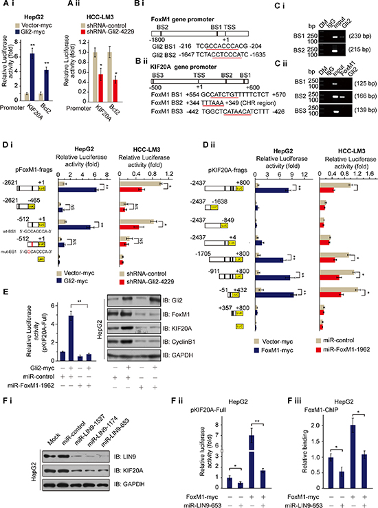 Figure 2: Gli2 regulates the expression of KIF20A by directly promoting FoxM1 expression. (Ai and Aii) KIF20A-luciferase constructs were transfected into HepG2 or HCC-LM3 cells with or without the indicated plasmids for 48 h and subjected to dual luciferase assay. Human Bcl2-luciferase constructs served as the positive control. *P < 0.05, **P < 0.01. (Bi and Bii) Schematic diagrams of the FoxM1 and KIF20A promoter regions indicate the putative transcription factor binding sites. (C) Chromatin was isolated from HCC-LM3 cells, and ChIP assays were performed with control (IgG), anti-Gli2 or anti-FoxM1 antibodies. Specific primers for each putative binding element were used for the PCR analyses. DM, DNA marker. (Di) A series of FoxM1-luciferase constructs (left) were transfected into HepG2 or HCC-LM3 cells with or without the indicated plasmids for 48 h and subjected to dual luciferase assay. (Dii) A series of KIF20A-luciferase constructs (left) were transfected into HepG2 or HCC-LM3 cells with or without the indicated plasmids for 48 h and subjected to dual luciferase assay. *P < 0.05, **P < 0.01. (E) The KIF20A promoter and Gli2-myc or miR-FoxM1-1962 were transfected into HepG2 cells in triplicate. Relative KIF20A promoter activities were measured 48 h after transfection by the dual luciferase assay (left). And the proteins harvested from the cells were subjected to WB analysis (right). **P < 0.01. (Fi) HepG2 cells were transfected with miR-control or miR-LIN9 for 48 h and harvested for WB analysis with the indicated antibodies. (Fii) The KIF20A promoter and FoxM1-myc or miR-LIN9 were transfected into HepG2 cells in triplicate. Relative KIF20A promoter activities were measured 48 h after transfection by the dual luciferase assay. *P < 0.05, **P < 0.01. (Fiii) FOXM1 ChIP was performed on promoters of the KIF20A after knockdown of LIN9 or in the presence of a scramble miR-control. *P < 0.05.