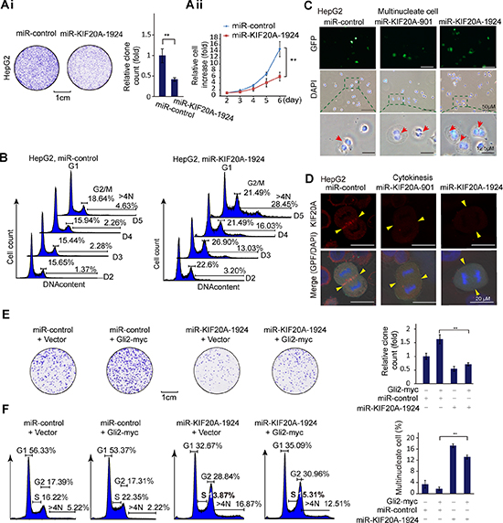 Figure 3: The Gli2-KIF20A axis mediates the growth of HCC cells by promoting cell cycle progression. (Ai) Representative clonogenic assay of HepG2 cells expressing the indicated plasmids. Quantitative analysis was performed using ImageJ software. The bar graph shows the means ± SD, n = 3, **P < 0.01. (Aii) HepG2 cells transfected with the indicated plasmids were harvested at the indicated time points, and the numbers of cells were expressed as the fold change relative to the first time point. The data shown represent the means ± SD, n = 3, **P < 0.01. (B) Cell cycle distributions of HepG2 cells from (Aii) were measured at the indicated time points using flow cytometry. (C) HepG2 cells transfected with the indicated plasmids were fixed and stained for DNA (DAPI stain). Binucleated/multinucleated cells were observed (indicated by an arrow). (D) HepG2 cells transfected with the indicated plasmids were subjected to an immunofluorescence assay for KIF20A expression. Yellow block arrows indicate the KIF20A location and the regressed cleavage furrows of mitotic cells in KIF20A knockdown cells. (E) HepG2 cells transfected with the indicated plasmids were subjected to clonogenic assays. Quantitative analysis was performed using ImageJ software. The bar graph shows the means ± SD, n = 3, **P < 0.01. (F) HepG2 cells transfected with the indicated plasmids for 72 h were subjected to cell cycle assays. The percentages of multinucleate cells were quantified as a histogram. The data shown represent the means ± SD, n = 3, **P < 0.01.