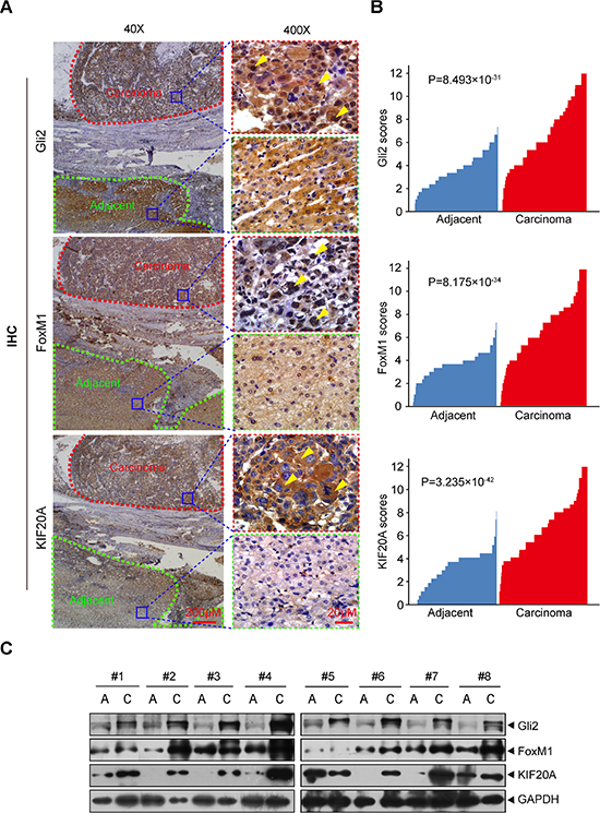 Figure 5: Gli2, FoxM1 and KIF20A are highly expressed in HCC tissues. (A) IHC detection of Gli2, FoxM1 and KIF20A expression in a representative HCC sample and a matched adjacent normal liver tissue sample. The areas of carcinoma and adjacent tissues were sketched. Subcellular locations of Gli2, FoxM1 and KIF20A were indicated by yellow arrows. (B) The expression of Gli2, FoxM1 and KIF20A was plotted using the immunohistochemical scores. Statistical significance was analyzed using the Wilcoxon matched-pairs signed-rank test. (C) Eight pairs of randomly selected HCC tissues and adjacent non-tumor tissues were subjected to Western blot analysis for Gli2, KIF20A and FoxM1.