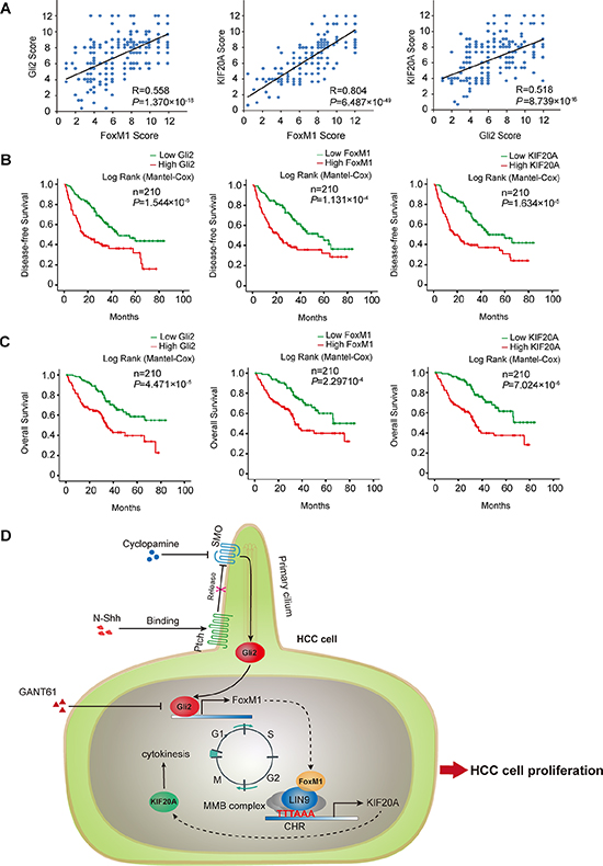 Figure 6: Gli2, FoxM1 and KIF20A are co-expressed in HCC and predict the survival outcome of HCC. (A) The correlation among Gli2, FoxM1 and KIF20A expression in HCC is displayed as a scatter diagram. The data were analyzed by the Spearman correlation test. (B, C) Kaplan-Meier curves were used to represent the difference in the overall survival and disease-free survival of HCC patients between the negative/low and medium/high expression groups for Gli2, FoxM1 and KIF20A. (D) A schematic model showing that the Gli2-KIF20A axis regulates the growth of HCC. Hh signaling activates Gli2, which directly transactivates FoxM1. Increased FoxM1 induces KIF20A transcription via the MMB complex, promoting mitosis of the cell cycle and proliferation of HCC cells. The inhibition strategy of the Gli2-KIF20A axis is shown to suppress HCC proliferation and growth in this study.