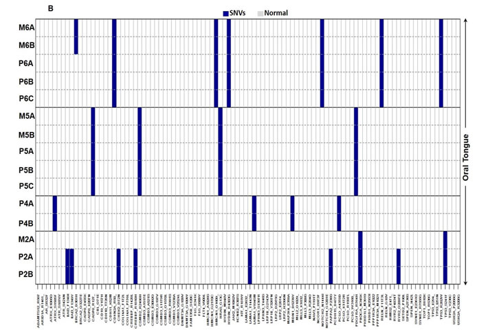 Specimens were collected from 2-3 locations separated by at least 5 mm in the primary tumor (P) and in most cases, the matched metastatic lymph node (M) to evaluate the degree of intratumoral mutational heterogeneity (Figure 1A). Tumor content was assessed using H&E staining of specimens to confirm > 70% tumor by volume of specimen. Of 202 genes (MTOR, NRAS, NOTCH2, FLG, IL6R, SPTA1, SPEN, DDR2, PAPPA2, HMCN1, USH2A, RYR2, ZNF238, ARID1A, CSMD2, MPL, JAK1, ERCC3, LRP1B, LRP2, ITGA4, CASP8, IDH1, PIKFYVE, IRS1, DNMT3A, ALK, SOS1, EML4, MSH2, MSH6, VHL, RAF1, FOXL2, ATR, MECOM, PIK3CA, ETV5, TGFBR2, MLH1, MYD88, CTNNB1, SETD2, PBRM1, BAP1, MITF, EPHA3, TET2, CRIPAK, FBXW7, FGFR3, WHSC1, PDGFRA, KIT, KDR, LPHN3, APC, CSF1R, PDGFRB, GABRA6, NPM1, FGFR4, NSD1, FLT4, CDH10, ADAMTS12, HEATR7B2, MAP3K1, PIK3R1, PRDM1, TNFAIP3, ESR1, SYNE1, MAP3K4, DDR1, NOTCH4, DAXX, PKHD1, BAI3, MDN1, RELN, PIK3CG, PPP1R3A, MET, SMO, BRAF, PRSS1, EZH2, MLL3, HDAC9, CARD11, IKZF1, EGFR, ELN, HGF, PCLO, CDK6, RIMS2, PKHD1L1, CSMD3, COL14A1, FAM135B, PTK2, CSMD1, FGFR1, KCNB2, RUNX1T1, PPP2R4, ABL1, TSC1, NOTCH1, CDKN2A, PAX5, JAK2, GNAQ, SYK, PTCH1, NFKB2, FGFR2, RET, PCDH15, GATA3, PTEN, CYP2C19, ATM, CBL, CHEK1, WT1, HRAS, MEN1, FAT3, PTPN11, HNF1A, KRAS, AKAP3, MLL2, ACVR1B, ERBB3, LRP1, CDK4, NAV3, ERCC5, FLT3, FLT1, BRCA2, RB1, TBC1D4, AKT1, SYNE2, TSHR, GABRB3, RAD51, MAP2K1, IDH2, IGF1R, ERCC4, TSC2, PALB2, CD19, CREBBP, CYLD, CDH11, CDH1, HYDIN, MAP2K4, NCOR1, NF1, HNF1B, ERBB2, TOP2A, BRCA1, SPOP, TP53, RNF213, AURKB, SMAD4, LAMA1, SMARCA4, STK11, NOTCH3, CPAMD8, JAK3, ZNF536, GNA11, CEBPA, TGFb1, PPP2R1A, ASXL1, TOP1, AURKA, GNAS, RUNX1, SMARCB1, CHEK2, NF2, EP300, KDM6A, ARAF, GATA1, FAM123B, AR and ATRX) analyzed, 57 genes had a total of 102 somatic single nucleotide variations in at least one of the primary or metastatic sites across the seven patients (Supplemental Table 3). None of the SNVs were shared between patients. Of the SNVs detected, 71 were only seen in primary tumor specimens with 48 being present in only one sample from the primary tumor. Overall there was a much higher number of SNVs identified in laryngeal tumors (72 distinct SNVs) compared to oral tongue tumors (24 distinct SNVs).