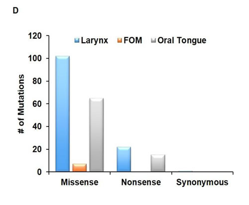 Various differences between the larynx, FOM and the oral tongue may account for the disparity of incidence in mutations at these sites. The anterior two-thirds [20] of the tongue and the floor-of-mouth arise from embryological arches 1 and 2, while the larynx develops from arches 3 and 4. The oral cavity is made up of pseudostratified epithelium to be more resilient to trauma during mastication, while the larynx has respiratory epithelium and is primarily exposed to air. The FOM is a horseshoe-shaped region beneath the tongue. HNSCC in the FOM can demonstrate rapid progression that is difficult to control locally and regionally. The most likely cause for the differences in mutation rates between various sites could be the extent of carcinogen exposure at these sites. The oral tongue has a larger surface area compared to the larynx. Further, the larynx is exposed to carcinogens during both inhalation and exhalation. As air flows over the larynx, eddy currents created by the false vocal cords increases exposure to the region. The increased exposure to carcinogen could account for an increase in mutation rates in tumors of the larynx compared to the oral tongue.