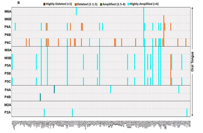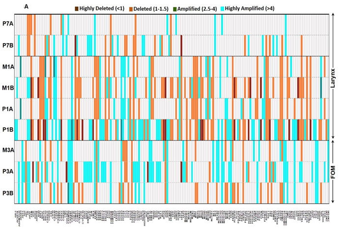 Figure 3: Heterogeneity in copy number varies based on the sub-site or origin. The copy number variability identified within A. laryngeal (patient 1 and 7) and FOM (patient 3) tumors, and B. oral tongue tumors. The key specifies the color code to depict the status of CNVs in each gene. Larynx and FOM tumors demonstrated significantly higher number of CNVs compared to oral tongue tumors.