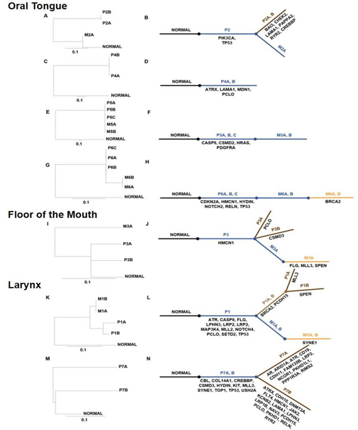 Figure 4: Evolutionary analyses of mutated codons in HNSCC from various sites. Panels A., C., E., G., I., K. and M. represent midpoint-rooted phylogenetic trees of the tumors using the maximum likelihood approach. The branch lengths are proportional to the number of nonsynonymous mutations between the branching points. The scale bar represents 0.1 substitutions per site. Panels B., D., F., H., J., L. and N. represent the evolutionary models of tumors in each patient and list the mutated genes in each cluster. The commonly mutated genes are in dark blue and genes with unique mutations are listed below the brown and orange lines for the primary and metastatic tumor, respectively.