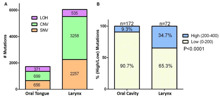 Somatic mutation data were downloaded from the public TCGA data repository website, cBioportal.org, from the Memorial Sloan Kettering Cancer Center. Data from 172 oral cavity and 72 larynx SCC patients were included in the analysis. The number of patients with low (</=200) and high (>200) mutation counts were determined.