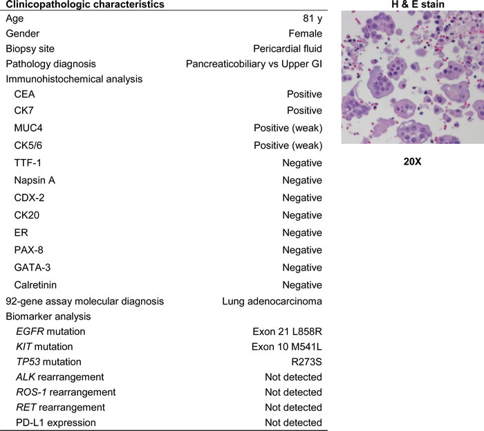 In one case, a 64 year old female presented with malignant cells in a pleural effusion (Table 3). The pathology report indicated a diagnosis of adenocarcinoma with possible primary sites including the lung, pancreaticobiliary tract, and genital tract based on immunohistochemical stains. The 92-gene assay provided a molecular diagnosis of lung adenocarcinoma (probability = 96%), with all other suspected primary sites ruled out with 95% confidence. Predictive biomarker analysis detected a deletion of exon 19 in EGFR, while ALK rearrangement and ROS-1 rearrangement were not detected (Table 3). These data indicate potential benefit from treatment with targeted molecular therapies. In another case, an 81 year old female presented with malignant cells in a pericardial effusion and was initially suspected to have a pancreaticobiliary or upper gastrointestinal malignancy (Table 4). The 92-gene assay resulted in a diagnosis of lung adenocarcinoma (probability = 90%) with an EGFR L858R mutation, enabling eligibility for EGFR targeted therapy options.