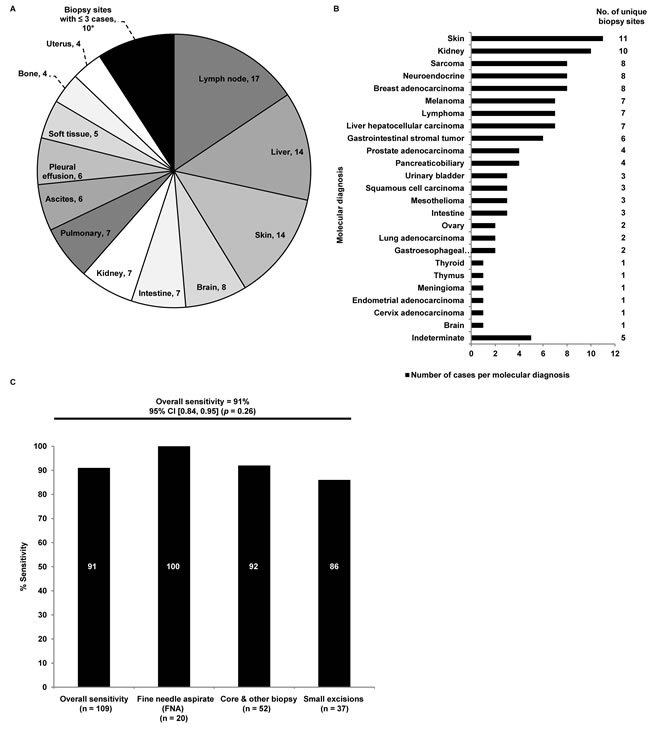 Figure 2: A. Distribution of biopsy sites from clinical validation cohort. *Biopsy sites with three or fewer cases were combined into a single category, which includes: Breast (3), Adrenal (2), Mediastinum (2), Prostate (2), Retroperitoneum (1). B. Distribution of molecular diagnoses as determined by the 92-gene assay in the limited tissue data set. Molecular diagnoses labeled on the y-axis. Number of unique biopsy sites for each molecular diagnosis is labeled to the right of the graph. C. Sensitivity of the 92-gene assay for each specimen type in the limited tissue data set (p = 0.26). Specimen type labeled along the x-axis. Sensitivity expressed as a percentage is shown by each column. Exact values per specimen type are shown in white. Overall sensitivity for the 92-gene assay was 91%.