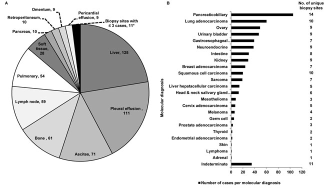 Figure 3: A. Distribution of biopsy sites within the clinical cytology case series that passed analytical QC (N = 558). *Biopsy sites with three or fewer cases were combined into a single category, which includes: Mediastinum (3), Bowel (2), Breast (2), Kidney (2), Adrenal (1), Periaortic (1), Thyroid (1). B. Distribution of molecular diagnoses as determined by the 92-gene assay in the clinical cytology data set that passed analytical QC (N = 558). Molecular diagnoses labeled on the y-axis. Number of unique biopsy sites for each molecular diagnosis is labeled to the right of the graph.