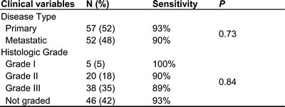 The 92-gene assay predicted a molecular diagnosis in 95% (N = 104) of cases (the remaining 5 cases were indeterminate) when compared to the gold standard of adjudicated histopathological diagnoses with integration of clinical findings and ancillary testing. The overall sensitivity in these cases was 91% [95% confidence interval (CI) 0.84 - 0.95; Figure 2C]. There was no difference in sensitivities between primary and metastatic cases (p = 0.73; Table 2). It was previously demonstrated in a large blinded validation study that the assay maintained high accuracy irrespective of specimen type (limited tissue vs non-limited tissue) [8]. In the current study, the performance of the 92-gene assay in the limited tissue subset was further analyzed and stratified based on biopsy types. Performance of the assay was consistent across biopsy types (FNA/cell blocks = 100%, core and other biopsies = 92%, small excisions = 86%; p = 0.26; Figure 2C) and across histologic grades (I = 100%, II = 90%, III = 89%, not graded = 93%; p = 0.84; Table 2). No statistical difference in performance was observed across graded tumors (histologic grades I, II and III; p = 0.75).