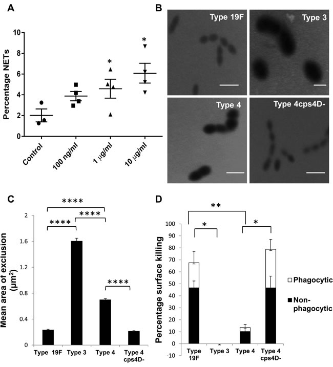 Figure 1: Capsule polysaccharide induces NETs and protects pneumococci from neutrophil-mediated surface killing. A. Bone marrow-derived neutrophils were stimulated for 2 h with various concentrations of purified capsule polysaccharide from serotype 4 (x-axis). Percentage NETs data (y-axis) are presented as means ± SE (n = 3 independent experiments per group). The purified capsule polysaccharide induced NETs in a concentration-dependent manner. *indicates P value < 0.05. B. FITC-dextran (2000 kDa) exclusion assay was performed to estimate the capsule size of pneumococcal strains. Representative images from FITC-dextran exclusion assay. Scale bars = 2 μm. C. Serotype 3 had the largest capsule (~8-fold > 19F) followed by serotypes 4 and 19F. Serotype 4 capsule mutant had significantly smaller (~3-fold) capsule than its wild-type. n = 100 bacterial cells per strain. D. Serotype 3 was completely resistant to neutrophil-mediated killing, whereas serotype 19F was easily killed (almost 70%). Serotype 4 was killed to a lesser extent (~10%), while its capsule mutant (4cps4D- lacking the cps4D gene) was highly susceptible to killing (~80%). For all strains, non-phagocytic killing predominated over phagocytic killing. Data are presented as means ± SE (n = 3 per strain). *indicates P < 0.05, **P < 0.01, ****P < 0.0001.