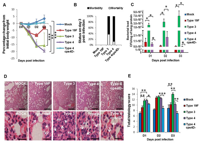Figure 2: Capsule thickness correlates with pneumococcal virulence during primary lung infection in mice. BALB/c mice were intratracheally infected with 107 CFU of serotypes 19F, 3 and 4 as well as the capsule mutant of type 4 (4cps4D-). Lungs were harvested on 1, 2 and 3 days post-infection (dpi). A. Infection with both serotypes 3 and 4 caused significant body weight loss until 3 dpi, whereas serotype 19F recovered by 3 dpi, while 4cps4D- failed to cause any clinical symptoms. B. Both serotypes 3 and 4 induced 100% morbidity, with type 3 causing higher mortality. Type 19F and 4cps4D- did not cause any morbidity. C. Primary infection of mice with serotype 3 led to the highest bacterial load in the lungs. Serotype 4 (wild-type) exhibited bacterial load, whereas its capsule mutant was absent in the lungs. D. Hematoxylin and eosin staining of lung sections revealed considerable neutrophil infiltration (arrows) in the alveolar spaces (AV) arising from infection with types 3, 4 and 19F. Mock control and 4cps4D- displayed the least neutrophil presence in lungs. Magnification and scale bars: top panels = 100× & 500 μm; lower panels = 1000× & 25 μm. E. Histopathologic scoring revealed the worst lung pathology caused by serotype 3, while types 19F, 4 and 4cps4D- showed less infiltration by 3 dpi. Data are presented as means ± SE (n = 8 per group). *indicates P < 0.05, **P < 0.01, ***P < 0.001.