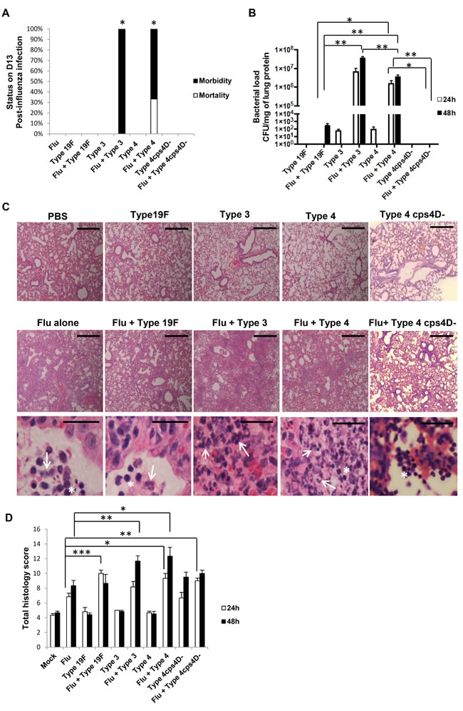 Figure 4: Capsule thickness alone does not determine the severity of secondary pneumococcal pneumonia after primary influenza infection. BALB/c mice were first intratracheally infected with 5 PFU of PR8 influenza virus (sub-lethal dose), followed by 100 CFU of S. pneumoniae after 7 days. Mice were monitored daily until they lost 30% of initial body weight or were euthanized at specific time-points. Lungs were harvested at 24 and 48 h after secondary infection. A. Secondary infections with both serotypes 3 and 4 led to 100% morbidity by day 10, while mice in other groups survived until the experimental end-point. Kaplan-Meier analyses revealed that survival rates of secondary infections with types 3 and 4 were statistically lower than influenza alone, and secondary infections with types 19F and 4cps4D-. n = 3 per group. *represents P < 0.05. B. All the serotypes replicated efficiently in the lungs during secondary infection (after influenza) compared to bacteria infection alone. Secondary infections with serotype 3 followed by serotype 4 led to the highest pulmonary bacterial loads. However, the capsule mutant was not recovered from the lungs. C. Hematoxylin and eosin staining of lung sections revealed intense neutrophil infiltration (arrows) in the alveolar spaces of secondary infected groups of serotypes 3, 4 and 19F. Notably, secondary infection with 4cps4D- showed strong inflammatory cell infiltration, comprising mostly lymphocytes (asterisks). Magnification and scale bars: 100× & 500 μm (top two panels); 1000× & 25 μm (bottom panel). D. Histopathologic scoring revealed that secondary infections with serotype 4 (followed by serotype 3) suffered from the worst lung pathology. Data are presented as means ± SE (n = 6 per group). *denotes P < 0.05, **P < 0.01, ***P < 0.001.