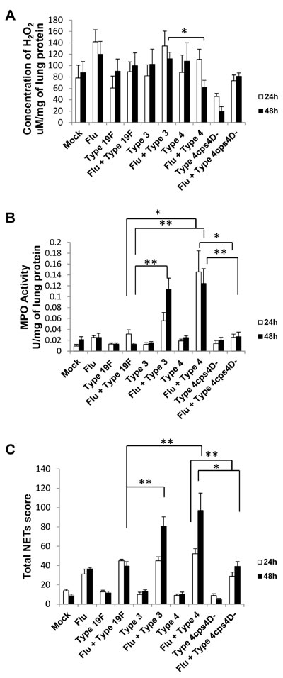 Figure 5: NETs and neutrophil activity in lungs generally correspond to disease severity after secondary pneumococcal infection. A. Lung H2O2 levels were generally elevated after secondary infection especially with serotype 3. B. Secondary infections with serotype 4 (followed by serotype 3) exhibited the greatest MPO activity in lungs. C. Secondary infections with serotype 4 (followed by serotype 3) also induced the highest pulmonary NETs score. Secondary infection with 4cps4D- resulted in significantly lower NETs and MPO activity than its wild-type. Data are presented as means ± SE (n = 6 per group). *P < 0.05, **P < 0.01.