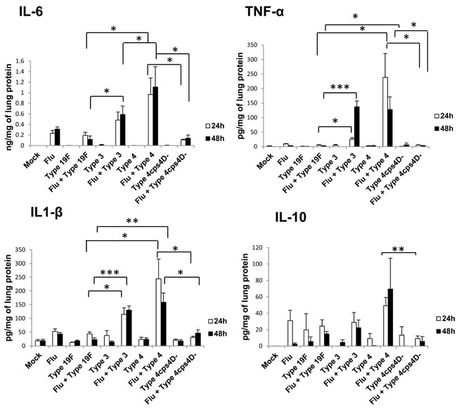 Figure 6: Secondary infection with virulent pneumococci induces augmented levels of pro-inflammatory cytokines in lungs. Secondary infections with serotype 4 (followed by serotype 3) elicited the highest cytokine levels. IL-17 was not detectable in the lung homogenates. Data are presented as means ± SE (n = 4 per group). *indicates P < 0.05, **P < 0.01, ***P < 0.001.