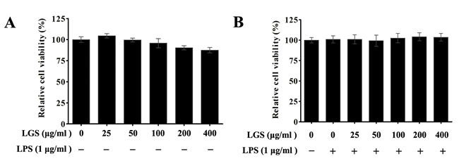 Figure 1: The cytotoxicity of LGS with or without LPS in RAW 264.7 macrophage cells. The viability was determined by MTT assay. A. Macrophages were incubated with LGS (25 ~ 400 μg/ml) alone for 24 h. B. Macrophages were treated with LGS at different concentrations in the presence of LPS (1 μg/ml) for 24 h. Data are represent as percentage of the cell viability as mean ± S.D. of three independent experiments.