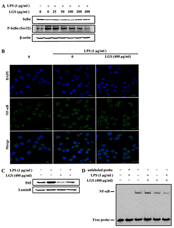 Figure 3: LGS inhibits the activation of NF-κB signaling in LPS-stimulated RAW 264.7 cells. A. LGS suppresses LPS-induced degradation and phosphorylation of IκBα. RAW 264.7 cells were stimulated with LPS (1 μg/ml) for 30 min and then treated with different concentrations of LGS for 24 h. The expression levels of IκBα and p-IκBα (Ser32) were examined by western blotting. B.-D. LGS blocks NF-κB p65 translocation from cytoplasm to nuclear. RAW 264.7 cells were stimulated with LPS (1 μg/ml) for 2 h, incubated with or without LGS (400 μg/ml) for 24 h and observed by confocal microscopy. (200 ×) (B). Expression of NF-κB p65 in nuclear was detected by western blotting (C) and NF-κB nuclear binding activity was measured by EMSA (D).