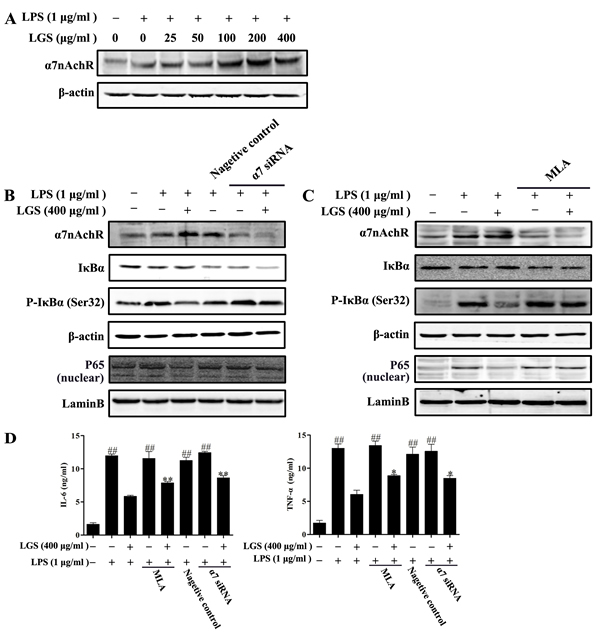 We further explored the role of α7nAchR in anti-inflammatory effects of LGS. Special α7nAchR siRNA (Figure 4B) or methyllycaconitine (MLA), a selective α7nAchR inhibitor (Figure 4C) was used to abrogate this protein. The results showed that the decrease of α7nAchR counteracted the inhibitory effects of LGS on the degradation and phosphorylation of IκBα and the nuclear translocation of NF-κB in LPS-stimulated RAW 264.7 cells. Moreover, the inhibition of α7nAchR could also decrease the suppressive effects of LGS on the levels of IL-6 and TNF-α (Figure 4D). These data demonstrate that LGS inhibits inflammation and NF-κB pathway which is associated with the activation of cholinergic anti-inflammatory pathway.