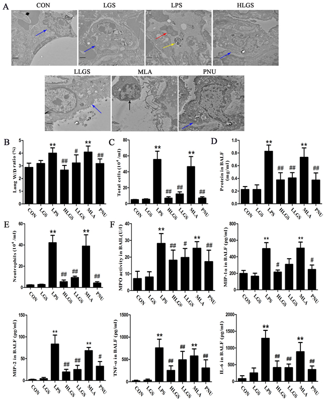 Lung type II alveolar cell is regard as the protective barrier of lung and osmilphilic multilamellar body is a key structure in the type II alveolar cell to maintain cellular homeostasis [23, 24]. As shown in Figure 6A, normal lung type II alveolar cell (blue arrow) was exerted in the CON and LGS groups. Osmilphilic multilamellar body (yellow arrow) was excluded from lung type II alveolar cells in the LPS group and the lung type II alveolar cell (black arrow) was removed from the basement membrane in the MLA group, indicating the destroy of lung type II alveolar cells. It also found that inflammatory cells (red arrow) were existed in alveolar spaces in the LPS group. However, after LGS treatment, inflammatory cells were decreased and the damage on lung type II alveolar cells was inhibited, suggesting that LGS can suppress edema and inflammation. Moreover, LGS could down-regulate the oedematous indicators, including lung W/D ratio (Figure 6B), total protein (Figure 6C), total cells (Figure 6D) and neutrophils (Figure 6E) which were similar as PNU treatment. In addition, LGS attenuated inflammatory-associated factors, such as MPO, MIP-1α, MIP-2, TNF-α and IL-6 in BALF in LPS-induced ALI (Figure 6F). However, these effects of LGS could be counteracted by MLA. Taken together, our results indicate that LGS suppresses edema and inflammation in LPS-induced ALI rats through cholinergic anti-inflammatory pathway.