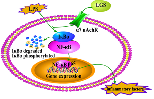 In summary, we first found that LGS has significantly anti-inflammatory effects in vitro and in vivo. We elucidated the underlying mechanism that involves stimulating α7nAchR to suppress NF-κB pathway (Figure 8). Our study provides a rationale for the clinical application of LGS as an anti-inflammatory agent and supports the critical role of cholinergic anti-inflammatory pathway in inflammation, especially α7nAchR as an important anti-inflammatory target. However, LGS is a formula with multiple components, which inevitably leads to the complexity of pharmacological effects and molecular mechanisms. Therefore, to explore the specific anti-inflammatory component(s) of LGS is urgently needed.