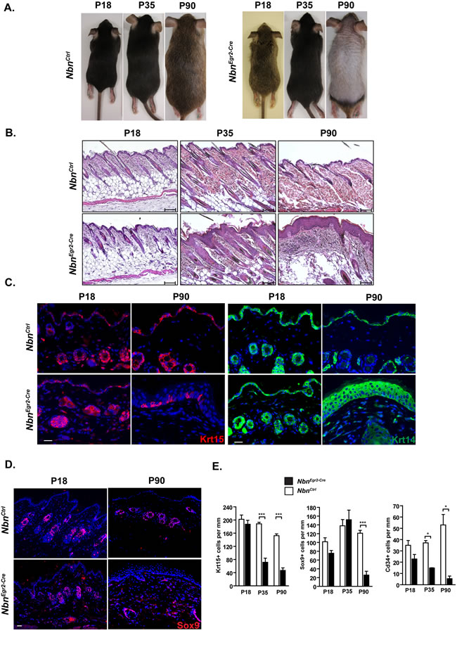 To determine the importance of Nbn in skin homeostasis, we performed conditional post-natal Nbn inactivation in HF progenitors using Egr2-Cre mice [15, 16]. Egr2-Cre would allow the deletion of Nbn as early as P1 in HF progenitors and epidermis [17]. We found that Nbn deficiency in HF progenitors promoted increased DNA damage signaling, stimulating Cdkn2a (p16INK4A) up-regulation, Trp53 stabilization, secretion of cytokines such as Il6 and Il1b, growth arrest leading to progressive reduction of Krt15-positive (Krt15+) and Cd34-positive (Cd34+) cells and premature hair loss. At later stages, the basal keratinocytes layer exhibited also DNA Damage signaling with Cdkn2a and Trp53 response but these changes in contrast to those in HF progenitor were associated with the absence of pro-inflammatory cytokines expression, increased proliferation, lack of differentiation and immune response reminiscent of psoriasiform dermatitis. Simultaneous Nbn and Trp53 inactivation significantly exacerbated this phenotype, mainly due to the lack of inhibition of pro-inflammatory cytokines secretion by Trp53.