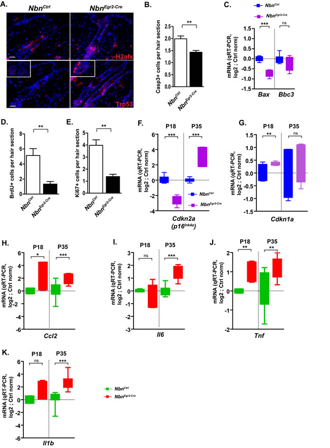 Figure 2: Nbn deficiency in HF progenitors triggers DNA damage response and secretion of pro-inflammatory cytokines. A. Increase of γ-H2afx foci and Trp53 stabilization in NbnEgr2-Cre HFs at P18. Scale bar 20 µm. B. Quantification of cleaved caspase 3 (Casp3+) in hair sections. NbnCtrl P18 (N = 3), NbnEgr2-Cre P18 (N = 4). C. Real-time RT-PCR analysis of Bax and Bbc3 (Puma) expression in NbnEgr2-Cre P18 skins. NbnCtrl P18 (N = 4), NbnEgr2-Cre P18 (N = 4). ***: p < 0.0001. D. Reduction of BrdU incorporation in NbnEgr2-Cre HF sections. NbnCtrl P18 (N = 3), NbnEgr2-Cre P18 (N = 4). *: p = 0.0108. E. Reduction of Ki67 positive (Ki67+) cells in NbnEgr2-Cre HF sections. NbnCtrl P18 (N = 3), NbnEgr2-Cre P18 (N = 4). *: p = 0.0108. Real-time RT-PCR analysis of Cdkn2a (p16INK4A) F. and Cdkn1a (p21Cip1/Waf1) G. expressions in NbnEgr2-Cre P18 and P35 skins. NbnCtrl (N = 4), NbnEgr2-Cre (N = 4). ***: p < 0.0001, **: p = 0.0077. Real-time RT-PCR analysis of pro-inflammatory cytokines: Ccl2 H., NbnCtrl P18 (N = 2), NbnEgr2-Cre P18 (N = 3), NbnCtrl P35 (N = 6), NbnEgr2-Cre P35 (N = 6); Il6 I. NbnCtrl P18 (N = 2), NbnEgr2-Cre P18 (N = 2), NbnCtrl P35 (N = 5), NbnEgr2-Cre P35 (N = 5); Tnf J., NbnCtrl P18 (N = 2), NbnEgr2-Cre P18 (N = 3), NbnCtrl P35 (N = 5), NbnEgr2-Cre P35 (N = 5) and Il1b K., NbnCtrl P18 (N = 2), NbnEgr2-Cre P18 (N = 3), NbnCtrl P35 (N = 6), NbnEgr2-Cre P35 (N = 6). ***: p < 0.0001, **: p = 0.0085, *: p < 0.05.