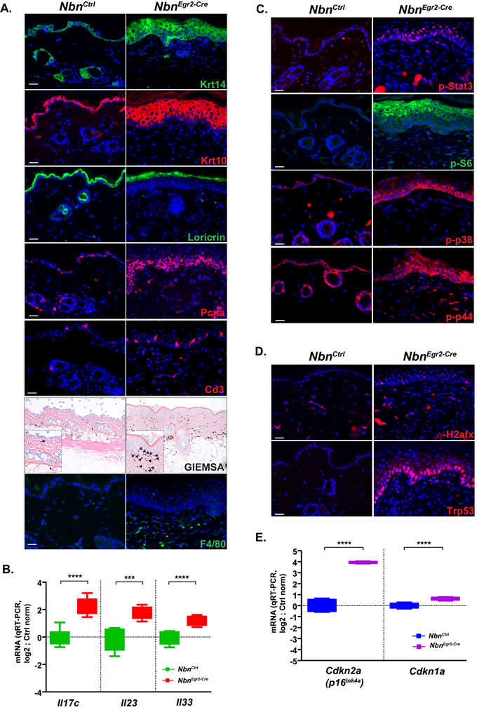 Figure 3: Nbn-deficiency promotes psoriasiform dermatitis. A. Characterization of the psoriasiform dermatitis and inflammatory response using various cell type markers: Krt14, Krt10 and Loricrin; proliferation marker: Pcna (scale bar 20 µm). Immunohistochemistry of P90 NbnEgr2-Cre skins indicates inflammatory response with T-cell marker (Cd3+, scale bar 20 µm), coloration of mast cells (blue) with GIEMSA (scale bar 40 µm) and macrophages (F4/80+). B. P90 NbnEgr2-Cre skins highly expressed typical human psoriasiform dermatitis interleukins Il17c, Il23 and Il33. NbnCtrl (N = 4), NbnEgr2-Cre (N = 4). **** : p < 0.0001, *** : p = 0.0002, ** : p = 0.0077. C. Up-regulation of p-Stat3, p-S6, p-p38 and p-p44 in P90 NbnEgr2-Cre skins. D. γ-H2afx foci in keratinocytes trigger Trp53 stabilization and E. increased Cdkn2a (p16INK4A) and Cdkn1a (p21Cip1/Waf1) expression in P90 NbnEgr2-Cre skins. NbnCtrl (N = 4), NbnEgr2-Cre (N = 4). ****: p < 0.0001.