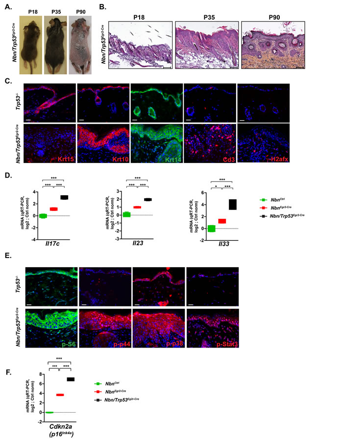 It was shown that TP53 mitigated the effects of the senescence-growth arrest by indirectly suppressing the accumulation and propagation of DNA damage [19] . To analyze the role of Trp53 in the Nbn-deficient skin phenotype, it was decided to simultaneously inactivate Nbn and Trp53 in the HFs progenitors. Trp53-deficient skins were phenotypically/morphologically very similar to NbnCtrl skins. NbnKrox20-Cre skins exhibited similar phenotype compared with the NbnKrox20-Cre ones including premature hair loss (Figure 4A), epidermis thickening, acanthosis and parakeratosis (Figure 4B), increased γ-H2afx foci, lack of Krt15+ cells and immune cell infiltration (Figure 4C). However, some phenotypical modifications including hair invagination, ectopic localization of Krt10+ and Krt14+ keratinocytes and increased thickening of epidermis were exacerbated in Nbn/Trp53Egr2-Cre skins (Figure 4B-4C). This observation was confirmed at a molecular level first by a significant increase of the mRNA expression of psoriasiform dermatitis markers Il17c, Il23 and Il33 (Figure 4D). Interestingly, while general pro-inflammatory cytokines including Il6, Il1b Tnf, and Ccl2 were expressed at their basal level in P90 NbnKrox20-Cre skins, they were robustly induced in Nbn/Trp53Egr2-Cre skins (Suppl Figure 2C). Pro-inflammatory cytokines induction was associated with increased activation of p38, p44 and Stat3 pathways illustrated by increased nuclear localization of their phosphorylated forms (Figure 4E). Interestingly, while p-S6 was restricted to the upper layers and Krt10+ keratinocytes in NbnKrox20-Cre epidermis, its expression in Nbn/Trp53Egr2-Cre spread to the basal layer (Figure 4E). These data indicated that in NbnKrox20-Cre skins, Trp53 inactivation dramatically worsens the Nbn-deficient phenotype by allowing the amplification of molecular pathways favoring impaired differentiation and proliferation thereby leading to the progression of psoriasiform dermatitis skins lesions towards eventually more advanced pre-neoplastic stages.