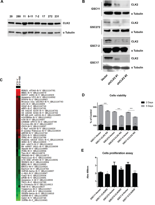 Figure 1: Role of CLK2 expression in GSCs. A, GSC lysates were collected, and CLK2 expression in the lysates was detected using Western blot analysis. B, GSC11, GSC272, GSC7-2 and GSC17 cells were infected with a lentivirus containing a control vector, CLK2 shRNA1, or CLK2 shRNA2. C, Hierarchical clustering was applied to protein expression data from RPPA results in vector shRNA and CLK2 shRNA in GSC272 cells. The protein expression levels in CLK2 shRNA-infected cells differed at least 1.6-fold from those in control GSC272 were selected for hierarchical clustering analysis. The red and green colors in the cells reflect relatively high and low expression, respectively. D, the cells were infected with a lentivirus containing a control vector or CLK2 shRNA, a volume of CellTiter-Glo Reagent was added to cells, and the luminescence was recorded. E, the GSCs per well were added to a 96-well plate with 20 μl of a combined MTS/PMS solution, and the plate was incubated for 3h 30min at 37°C in a humidified atmosphere. *P < 0.05; **P < 0.01; ***P < 0.001 versus control.