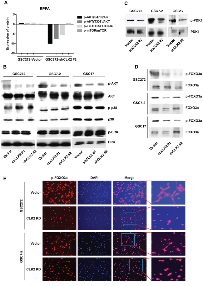 Figure 3: CLK2 regulates the phosphorylation of AKT and FOXO3a protein. A, the graph shows that the phosphorylation for AKT, FOXO3a, and mTOR normalized total expression of AKT, FOXO3a, mTOR in vector- and CLK2 shRNA-infected GSC272 cells. The gene expression levels were determined using RPPA analysis. B and C, GSCs of vector and CLK2 knockdown were incubated with bFGF and EGF for 1 hour. The cells were harvested, lysed, and analyzed using Western blotting. D and E, GSCs were incubated with bFGF and EGF for 24 hours. Phosphorylation of FOXO3a was assessed using Western blotting D, and immunofluorescence E. Phosphorylated FOXO3a stained red, and the nuclei were counterstained with 4',6-diamidino-2-phenylindole (blue).